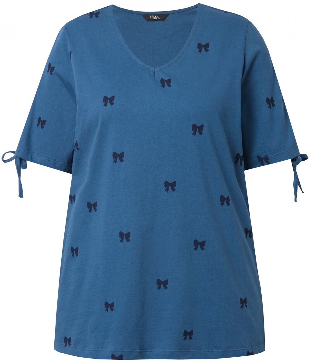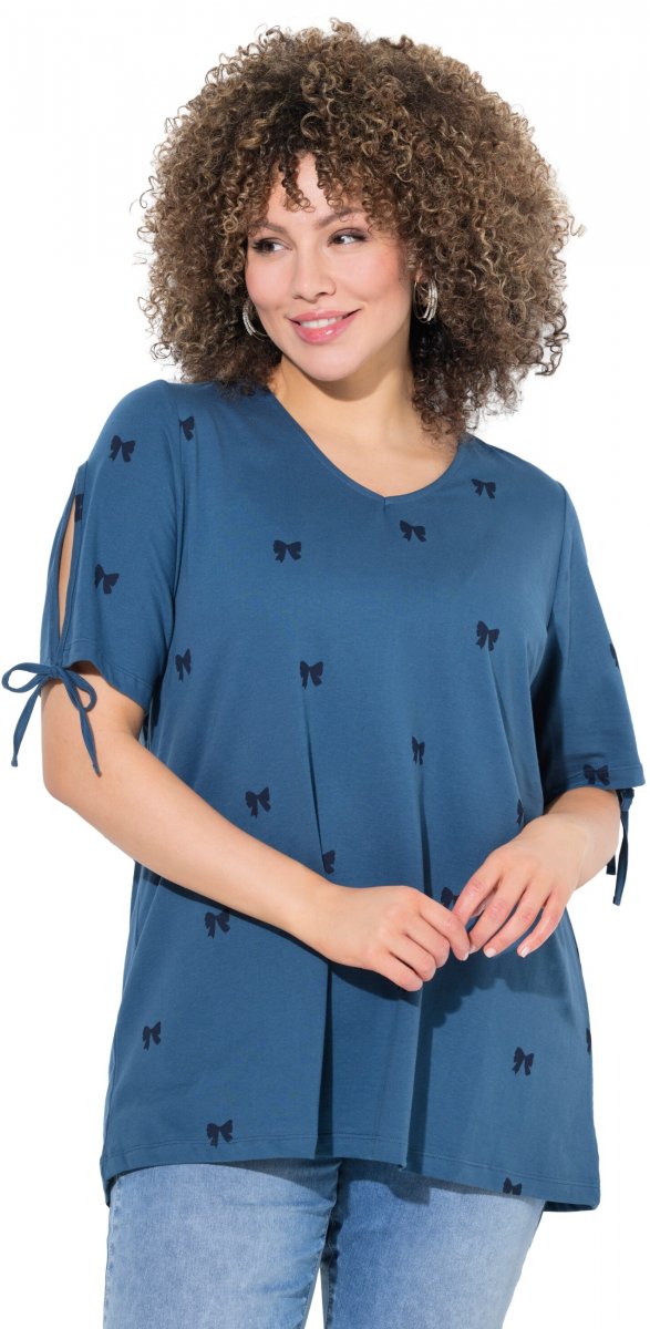 Ulla Popken Bow Print Split Sleeve Tee Indigo Denim