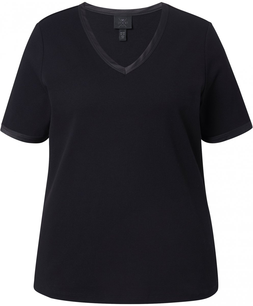 Ulla Popken Satin Trimmed Ribbed Jersey Short Sleeve T-Shirt Black